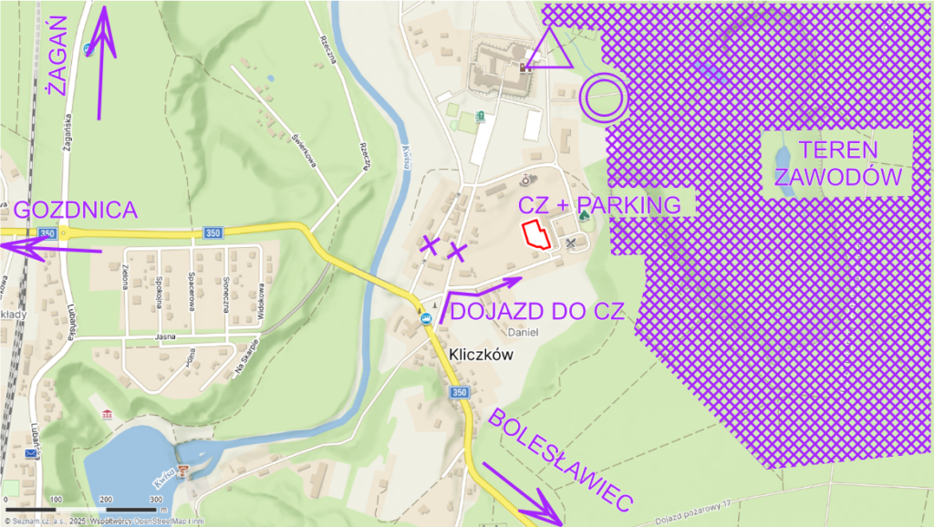 Na terenie zawodów są łąki wykorzystywane, jako tymczasowe wybiegi dla koni. Obszary mogą być wygrodzone pastuchem. W związku z brakiem pewności, które z łąk będą wykorzystywane w dniu zawodów, organizator postanowił o wyłączeniu potencjalnych ww. miejsc po przez zastosowanie symbolu 709 Teren zakazany.